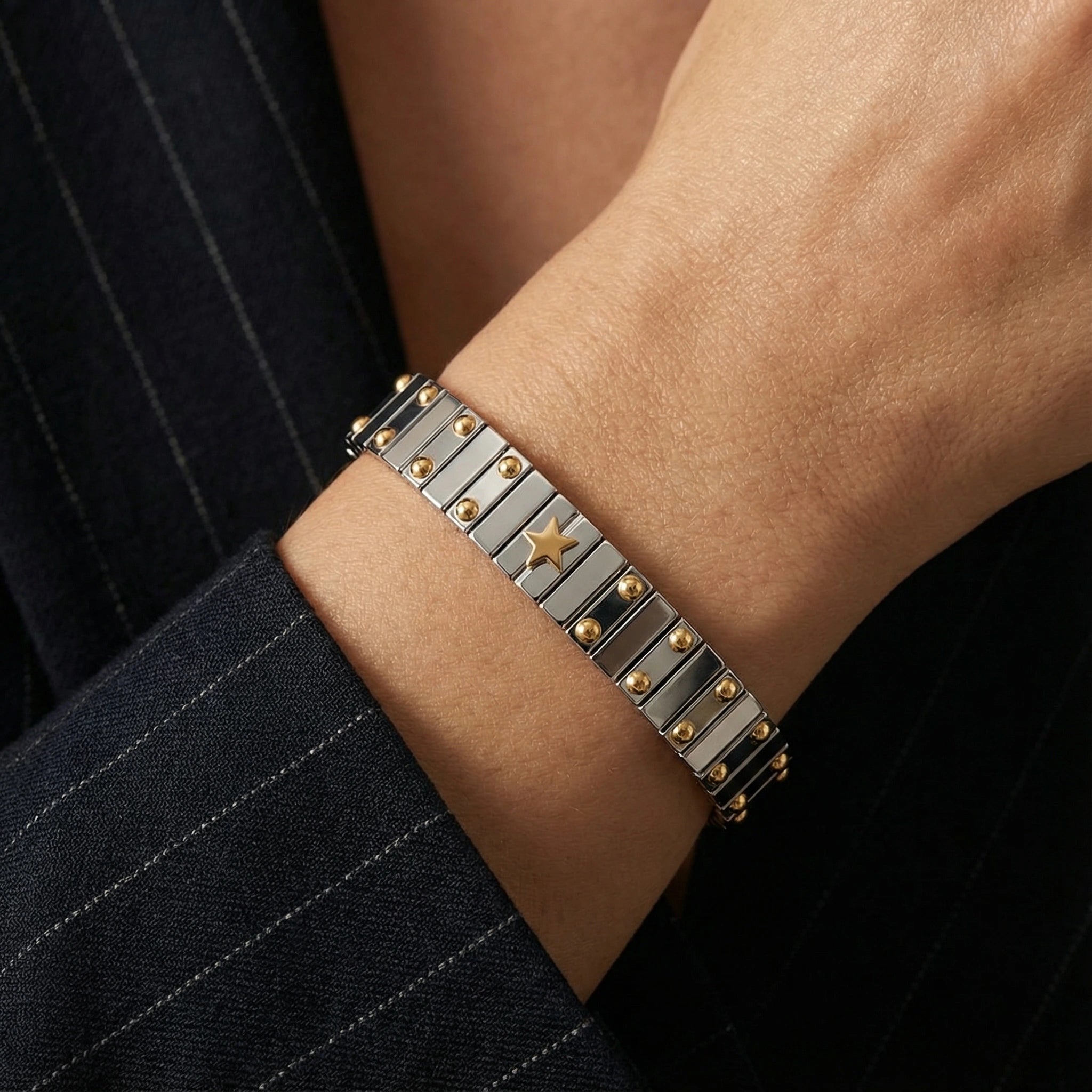 A play of contrasts, a bold look. This bracelet reinvents the style of watch bracelets with links adorned with varied patterns and colors depending on the model. Wear it alone for a refined touch or stacked with others for a bold and personalized look.